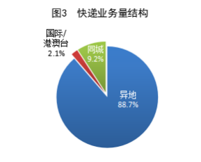 1-5月,同城、異地、國(guó)際/港澳臺(tái)快遞業(yè)務(wù)量分別占全部快遞業(yè)務(wù)量的9.2%、88.7%和2.1%。與去年同期相比,同城快遞業(yè)務(wù)量的比重下降0.2個(gè)百分點(diǎn),異地快遞業(yè)務(wù)量的比重上升0.2個(gè)百分點(diǎn),國(guó)際/港澳臺(tái)業(yè)務(wù)量的比重基本持平。