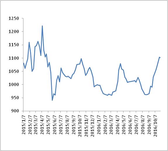 圖 1 2015-2016年各周中國(guó)公路物流運(yùn)價(jià)指數(shù)