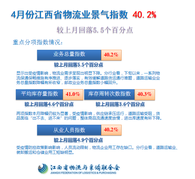 4月份,江西省物流業(yè)景氣指數(shù)(LPI)為40.2%,較上個(gè)月回落5.5個(gè)百分點(diǎn),受疫情沖擊影響,全省多點(diǎn)采取了封控、管控措施,交通管制、人員流動(dòng)受限,物流活動(dòng)嚴(yán)重受阻,12個(gè)分項(xiàng)指數(shù)除業(yè)務(wù)活動(dòng)預(yù)期指數(shù)外均有明顯回落。分行業(yè)看,各行業(yè)物流活動(dòng)比上月均有所回落,其中道路運(yùn)輸業(yè)下滑幅度依舊明顯。從物流服務(wù)品類上看,除與民生相關(guān)的農(nóng)產(chǎn)品、快消品、醫(yī)藥等領(lǐng)域小幅下滑,其他領(lǐng)域降幅顯著。
