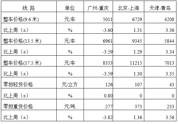 表1 本周部分線路平均價(jià)格及環(huán)比情況對(duì)比