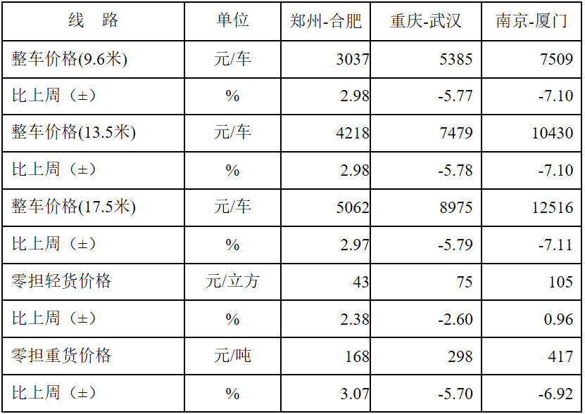 表1 本周部分線路平均價格及環(huán)比情況對比
