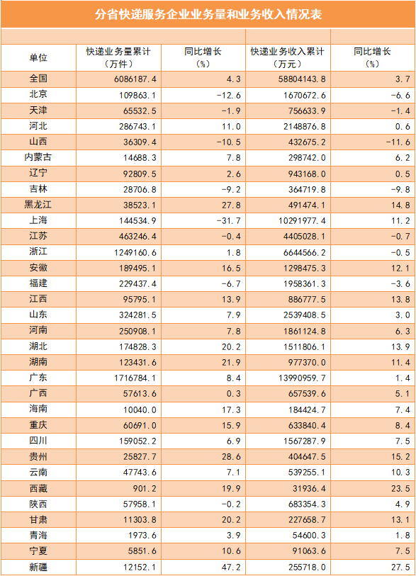1-7月,全國快遞服務(wù)企業(yè)業(yè)務(wù)量累計完成608.6億件,同比增長4.3%;業(yè)務(wù)收入累計完成5880.4億元,同比增長3.7%。其中,同城業(yè)務(wù)量累計完成73.1億件,同比下降4.9%;異地業(yè)務(wù)量累計完成525.2億件,同比增長6.3%;國際/港澳臺業(yè)務(wù)量累計完成10.3億件,同比下降17.8%。