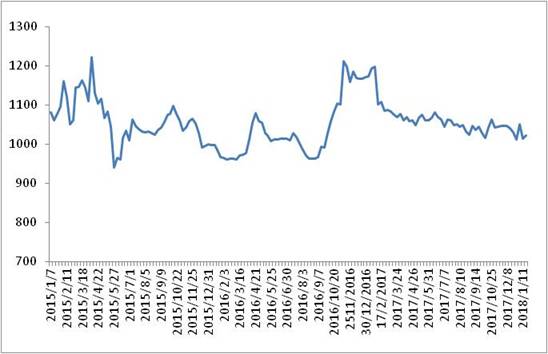 圖 1 2015-2018年各周中國(guó)公路物流運(yùn)價(jià)指數(shù)