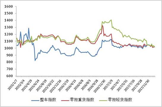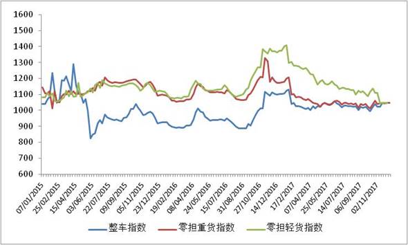 各車型指數(shù)漲跌不一,其中整車指數(shù)、零擔(dān)重貨指數(shù)環(huán)比回升,零擔(dān)輕貨指數(shù)環(huán)比回落。其中,整車指數(shù)為1020.3點,比上周回升0.16%;零擔(dān)輕貨指數(shù)為1021.3點,環(huán)比回落1.75%;零擔(dān)重貨指數(shù)為1018.8點,環(huán)比回升0.19%。