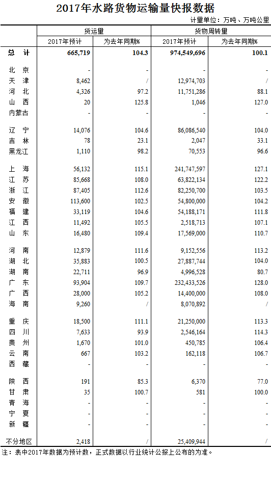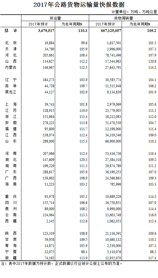 2017年全國(guó)公路、水路貨物運(yùn)輸量快報(bào)數(shù)據(jù)