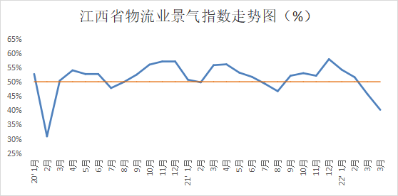 4月份,江西省物流業(yè)景氣指數(shù)(LPI)為40.2%,較上個(gè)月回落5.5個(gè)百分點(diǎn),受疫情沖擊影響,全省多點(diǎn)采取了封控、管控措施,交通管制、人員流動(dòng)受限,物流活動(dòng)嚴(yán)重受阻,12個(gè)分項(xiàng)指數(shù)除業(yè)務(wù)活動(dòng)預(yù)期指數(shù)外均有明顯回落。分行業(yè)看,各行業(yè)物流活動(dòng)比上月均有所回落,其中道路運(yùn)輸業(yè)下滑幅度依舊明顯。從物流服務(wù)品類上看,除與民生相關(guān)的農(nóng)產(chǎn)品、快消品、醫(yī)藥等領(lǐng)域小幅下滑,其他領(lǐng)域降幅顯著。