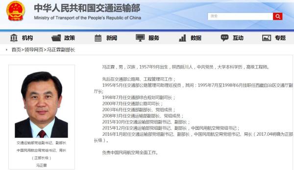 交通運(yùn)輸部官網(wǎng)“領(lǐng)導(dǎo)網(wǎng)頁(yè)”欄目信息顯示,現(xiàn)任交通運(yùn)輸部黨組副書記、副部長(zhǎng),中國(guó)民用航空局黨組書記、局長(zhǎng)馮正霖(1957.9)已于2017年4月明確為正部長(zhǎng)級(jí)。