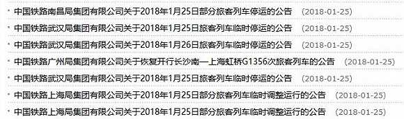 如,中國鐵路武漢局集團有限公司關(guān)于2018年1月25日旅客列車臨時停運的公告稱,因雪害影響: