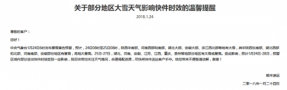 除了降雪,有的快遞公司在公告還提到,即將到來的“年貨節(jié)”,導致快遞業(yè)務(wù)量將出現(xiàn)小高蜂,也被認為是影響快遞取件、中轉(zhuǎn)和派件時效原因。